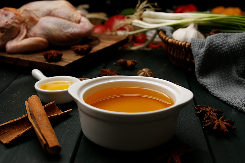 選用金鑼精煉雞油添加十余種香辛料熬制而成。產(chǎn)品色澤淺黃透明,蔥香濃郁,在烹調(diào)中起著增香亮色的作用
