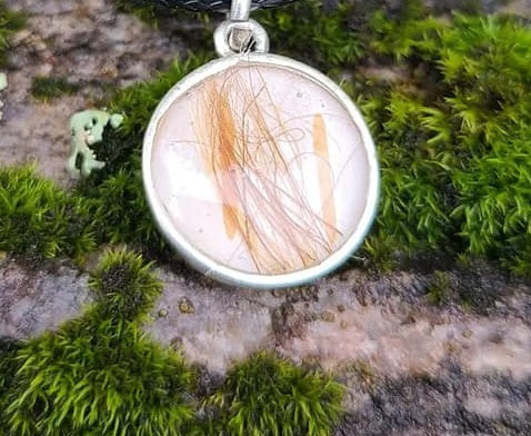 Pet Tribute necklaces are made with your pet's hair overlaid on Birch Bark and set in .999 silver.